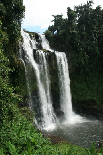 After the plantation and some delicious local green tea it was time for our first waterfall stop. Now we’d been rather disappointed by the waterfalls down in the 4000 islands but not so here. All three that we saw were gorgeous and quite different from each other, preventing the waterfall fatigue from setting in. The surrounding countryside was also far more lush and the verdant greens were a perfect backdrop for the cascades of water.