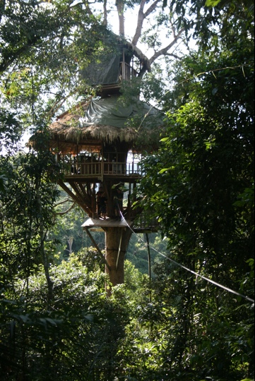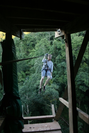 So here we were, head torches on, like modern-day cyclops’s in an early morning stupor, stumbling around in the blackness trying to pack our bags for the day ahead. I was the first person ready and donned my harness before approaching the gate with the exit wire. Looking out, my head torch pitifully illuminated a short length of cable disappearing into the darkness like a string of white cotton threading into the eye of a black hole. I remembered from the previous day the slack in the cable meant you literally felt you were dropping momentarily before it took your full weight. It was not a pleasant feeling and I couldn’t decide whether or not it was better not being able to see the drop to the jungle floor below. I stepped up and clipped my wheel in, held my breath and waited. “OKaaaay!” – the faint eerie shout of our guide echoed through the darkness from somewhere, indicating the line was clear for me to go. I launched tentatively off, the momentary plunge expected but still a mini heart-stopper. As I accelerated away from the treehouse I was enveloped in darkness, my light futilely showing nothing but a 10ft length of cable ahead. I looked down, my shoes appearing oversized in the light set against what seemed like a bottomless black abyss. Accelerating faster, my body was sprayed by an invisible mist, the heavy moisture in the air heightening my senses as I plunged through the gloom, apparently caught helplessly in some ungodly time portal into the underworld. My only gauge of time and space was the building whine of my zip wheel, screaming through the stillness of the jungle, as I listened acutely for any change in pitch to indicate I was slowing and coming to the slack cable at the end. My feet brushed some branches, I sensed I was close only to scream on, pressing through the blurry murk. After what seemed like minutes, I saw a speck of light ahead – was it our guide or the grim reaper at the entrance to Hades? Only moments away I’d find out. I focussed on it, hopelessly trying to judge the distance as it punctuated the blackness. All too late I finally saw the features of the landing platform and braked hard, just managing to slow up before hitting the tree – I had made it!