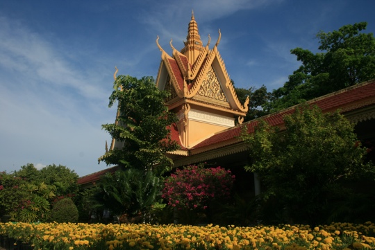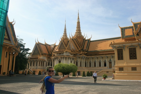 Arriving back in Phnom Penh, we tried to force ourselves out of this reflective mood by visiting the Royal Palace to remind us that the Khmer people (not to be confused with the Khmer Rouge) have a proud and civilized history outside of the Pol Pot years. The Palace itself is set in magnificent grounds of landscaped courtyards, walkways, imposing and ornate temples and pagodas and is a tranquil oasis of calm in the heart of this boisterous noisy city. The highlights included a 90 kg solid gold Buddha decorated with over 2000 diamonds and the Silver Pagoda, so called because its entire floor is laid with 5000 silver tiles weighing over 1kg each.