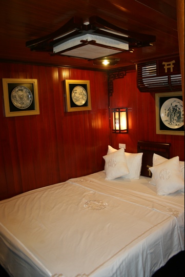 The next morning, after another day of manic motorbike dodging on the Hanoi streets and a slightly bizaar experience at the Water Puppet theatre, we were picked up from our hotel to be transported to Halong in a smart new minibus – things were looking promising. Three hours later we arrived in Halong City at Indochina Junks’ dockside reception. Minutes later we were slipping from the dock, in a tender launch with 13 other guests eager to board our new home. When we arrived aboard I was very impressed, this was no piece of floating junk but an elegant wooden vessel with a hint of old world nostalgia that made me think of Agatha Christie’s depiction of a Victorian Nile cruiser. Our cabin was a charming wood paneled room complete with double bed and generous en suite bathroom with rain shower. We had lucked in.