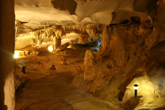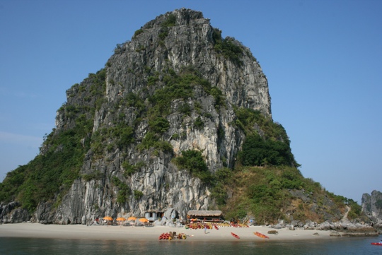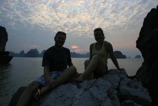 As we gently set sail out of the bay, the mayhem of Hanoi was left behind and we grabbed a beer and headed up top to the sun deck to lounge and meet our fellow cruisers. Before long we were called down for lunch in the dining room – something which turned out to a veritable 5 course feast of Vietnamese delicacies, each tantalizing our taste buds. By the time we had finished we were well and truly out in the bay and the impressive karst islands were slipping by like slow-motion scenery being pulled across a page. The peace and serenity of this seascape was truly mesmerizing and we really began to appreciate the marvel of these natural formations, actually formed by a massive limestone plateau that has been sinking, eroding and flooded over millennia to leave us with this maze-like archipelago.