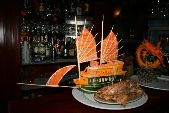 Dinner was another culinary extravaganza, this time seven courses of edible delectableness, with each of the main courses introduced with an amazing food sculpture prepared by different crew members, one taking nearly 5 hours to make! At the end of the meal our on-board representative introduced us to the crew and the captain before a little surprise was presented to Jo and I in the form of an elaborate cake, baked in honor of our Honeymoon (I would like to take credit for sneakily arranging this behind Jo’s back but this was a spontaneous effort from the crew after they had learned we were on our honeymoon). It was a lovely gesture, and typical of the genuine effort the crew and the operator made to make the trip special for everyone on board.