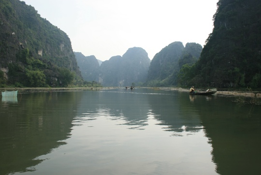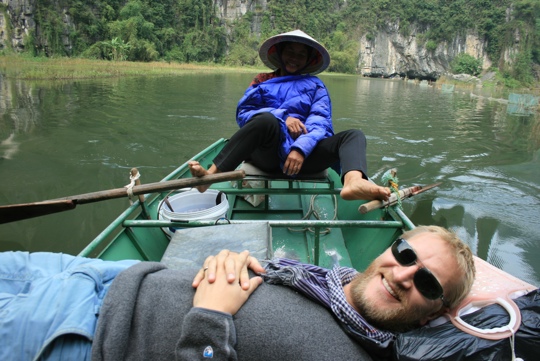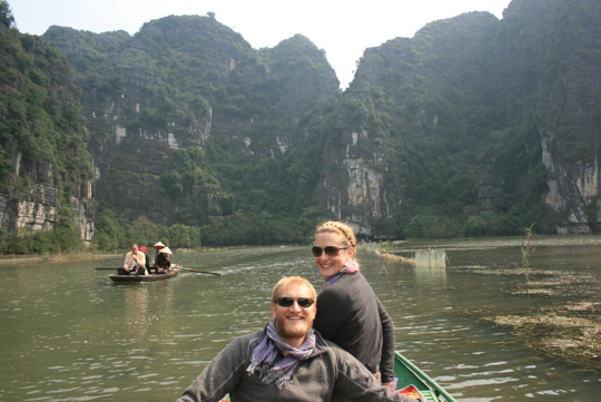 The scenery of Tam Coc is breathtaking. We had a couple of people doubt whether it was worth going to see it after we’d already seen Ha Long Bay but to me that’s like saying it’s not worth going to the Alps if you’ve been to the Rockies. We had got there early in the morning so that we missed the crowds of day trippers from Hanoi so we rowed peacefully along the river while on either side people were preparing the rice paddies for the next crop. You even get to go under some of the immense limestone kasks through caves, dodging stalactites while your comedy (and devilishly handsome) boat buddy calls a sinister “Mwa ha ha ha ha” which reverberates around you. One guess people.