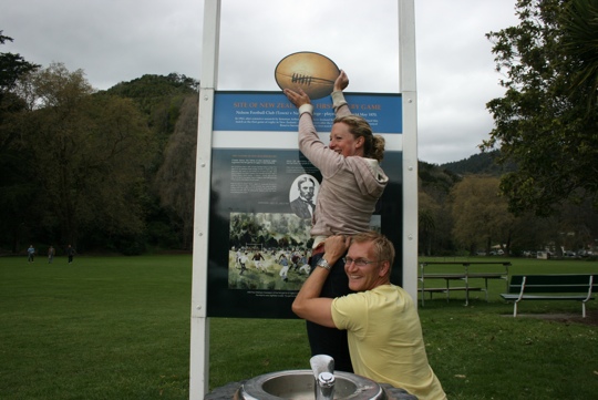One final piece of important business we had to attend to before we left Nelson was to visit a location of extreme historical importance – the site of the first ever rugby match in New Zealand, which was played at the foot of Botanical Hill on 14th May 1870 where Nelson rugby club trounced the lily-livered pansies from Nelson College 2-0. For those of you that don’t follow rugby, Clive and I are striking a ‘line out’ pose in the photo below.